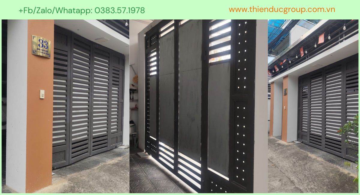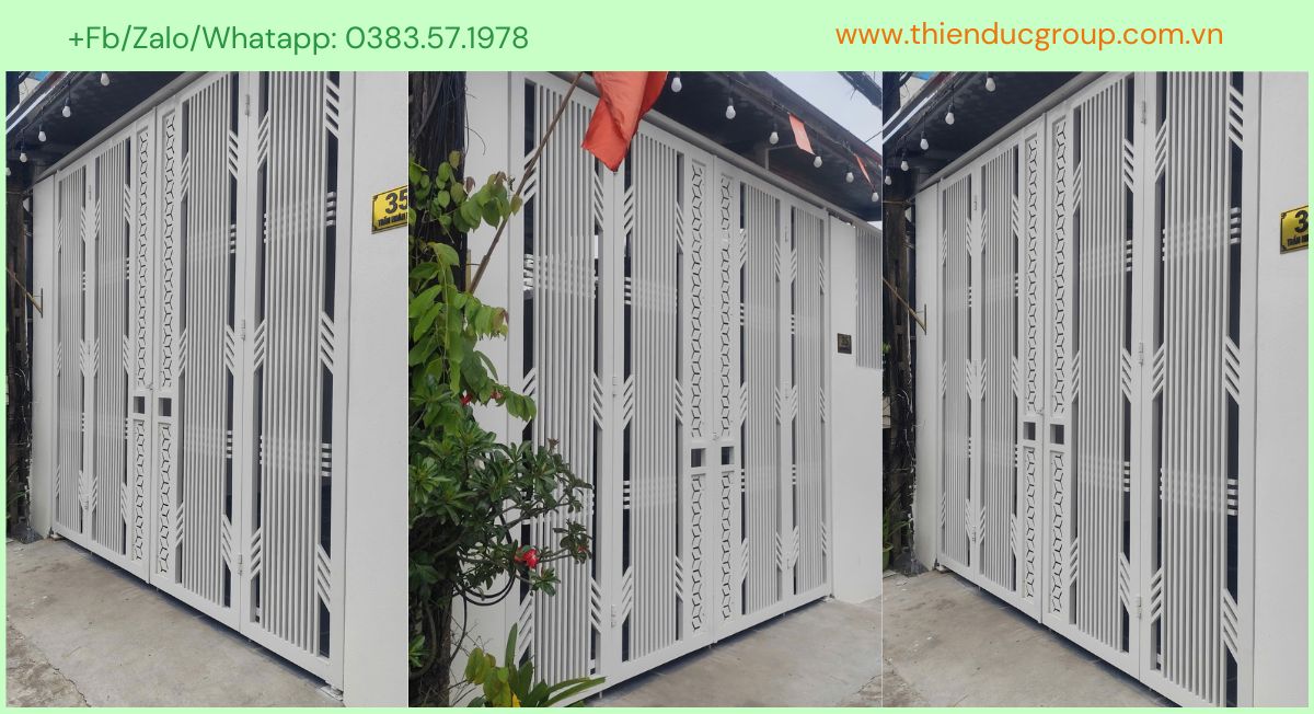 Khung cổng & cánh cổng: Làm từ inox, hợp kim nhôm hoặc thép mạ kẽm sơn tĩnh điện, vừa bền chắc vừa thẩm mỹ. Các cánh cổng được thiết kế dạng gấp khúc giúp dễ dàng xếp gọn khi mở.